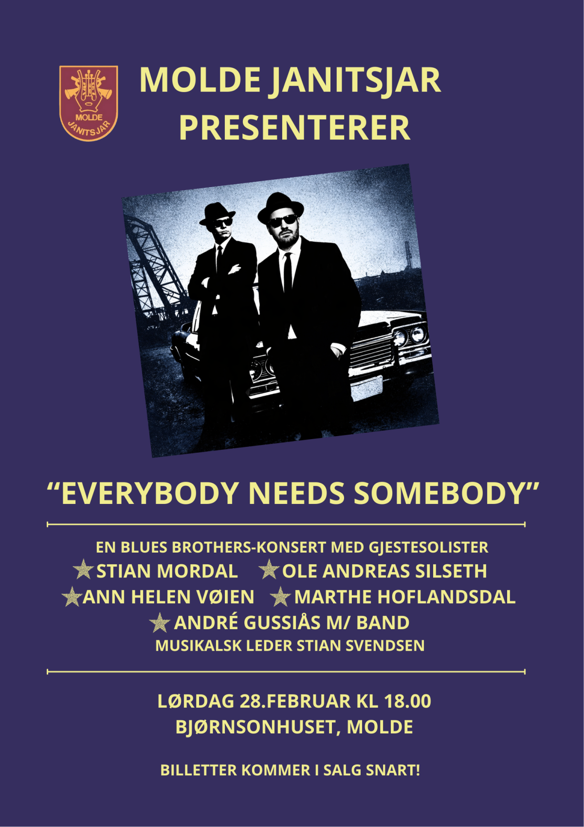 Lørdag 28.februar 2026 kl 18.00 i Bjørnsonhuset, Molde, setter vi de beste sangene fra Blues Brothers sin katalog opp på notestativene. Vi har med oss disse fantastiske gjestesolistene: Stian Mordal, Ole Andreas Silseth, Ann-Helen Vøien, Marthe Hoflandsdal og André Gussiås m/band. Vår musikalse leder er Stian E. Svendsen.